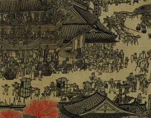 宋代张择端画的长卷清明上河图,是一幅反映北宋都城汴京(今河南开封)的社会生活风俗画,高24.8、长528.7厘米,水墨淡彩绢本。画卷以全景式的构图,精细的笔法,细致而真实地记录了宣和年间汴京繁华热闹的景象,展示了当时的经济面貌、城乡交流和民情风俗。